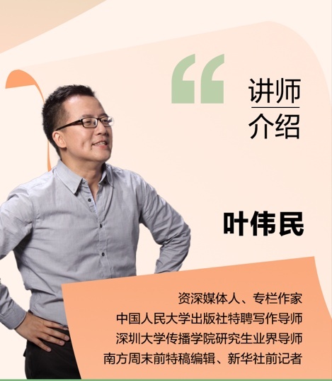 叶老师曾在媒体工作多年,在《新华社》《南方周末》等媒体历任记者和特稿编辑,积累了十多年的一线写作和编辑经验。离开媒体后,叶老师一直在深耕写作课程,是中国人民大学出版社特聘写作导师,并出版了专著。
