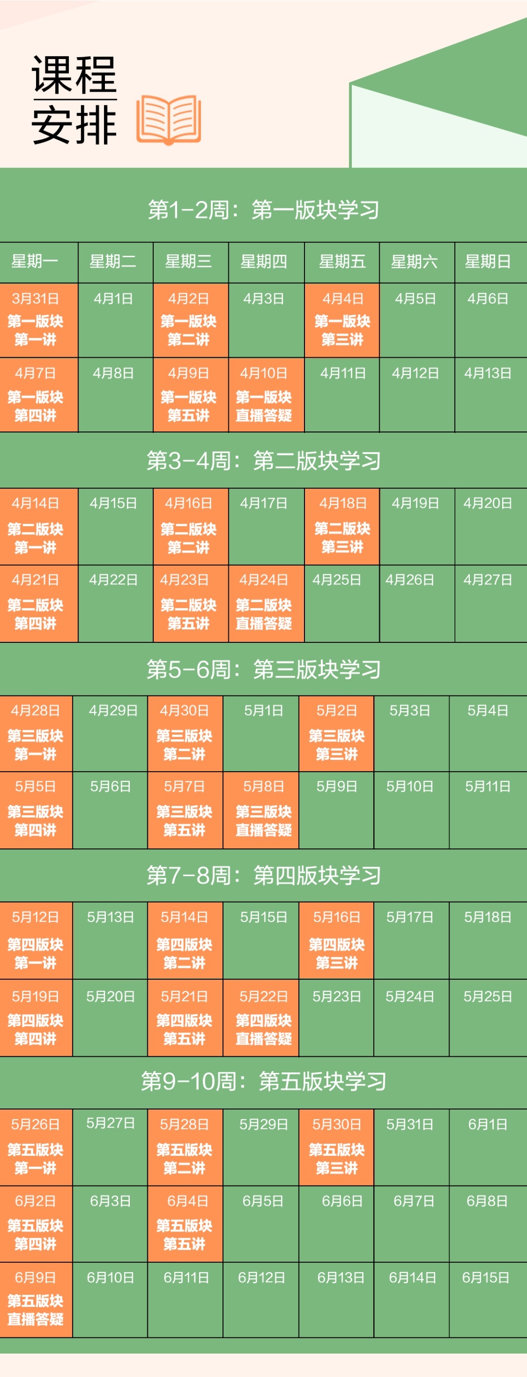 直播答疑,每一个版块,我们都配置了一节直播答疑,5个版块,一共5场直播答疑。老师将在正课的基础上,以视频问答的形式和同学们面对面交流,为大家解疑学习和日常中遇到的问题与难点。