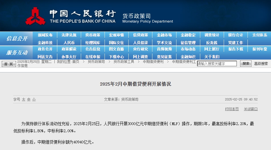 中国人民银行今日(2月25日)发布公告称,为保持银行体系流动性充裕,2025年2月25日,中国人民银行开展3000亿元中期借贷便利(MLF)操作股票买卖平台,期限1年,最高投标利率2.20%,最低投标利率1.80%,中标利率2.00%。操作后,中期借贷便利余额为40940亿元。